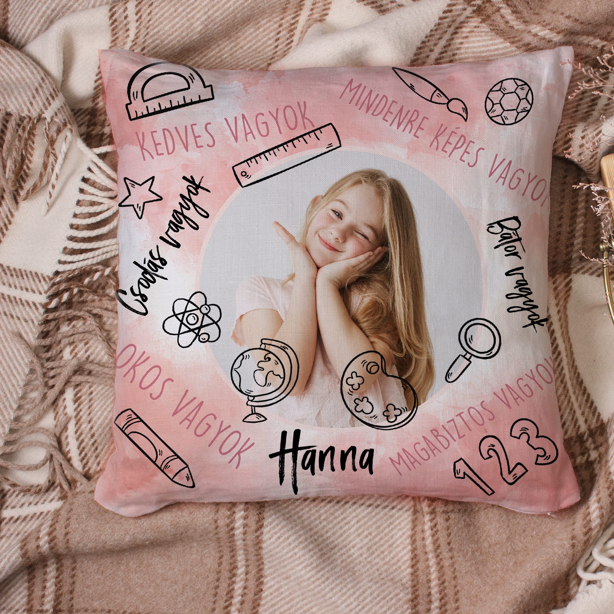 Csodás vagyok, bátor vagyok párna rózsaszín háttérrel névvel