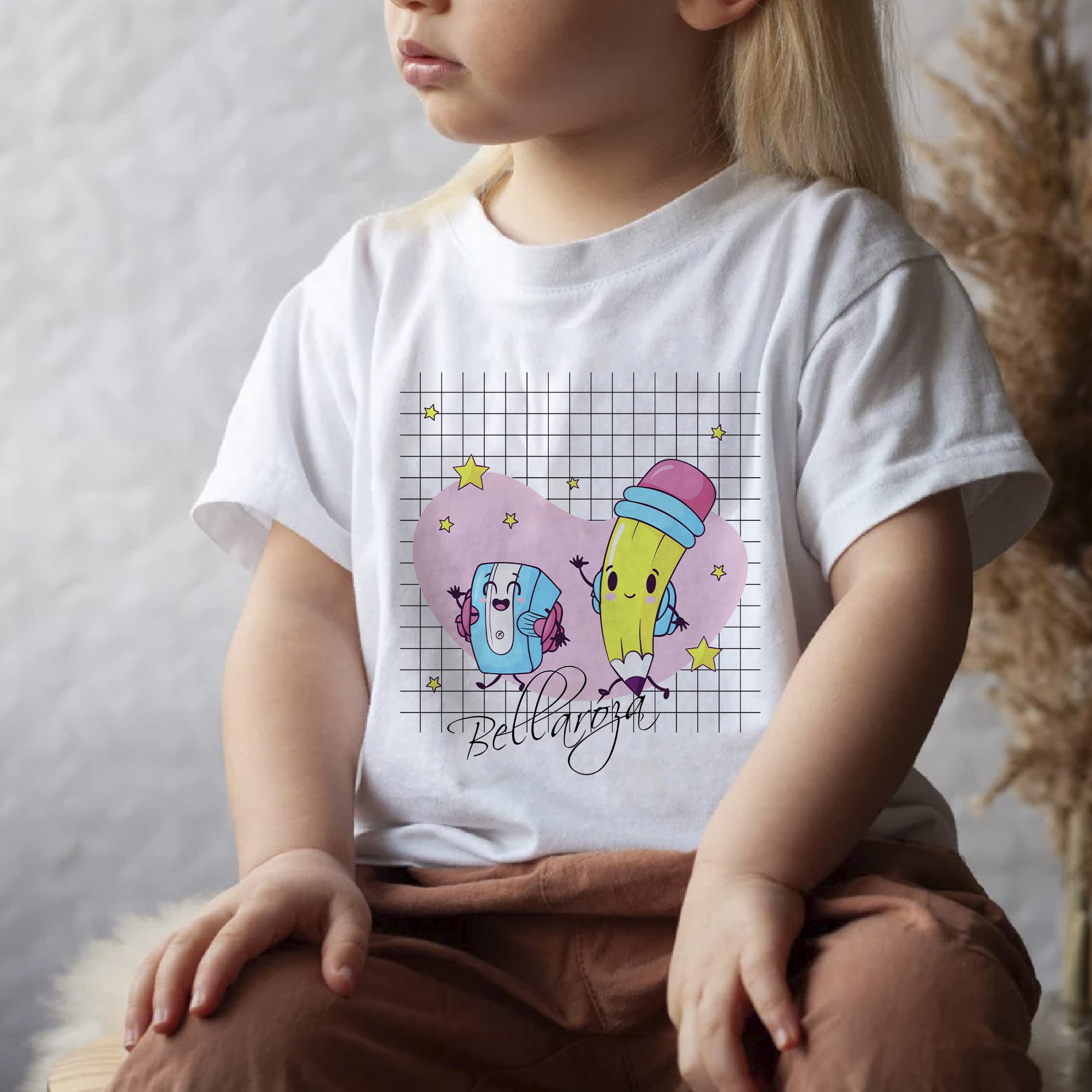 Iskolás gyerek póló ceruza és hegyező motívummal, névvel