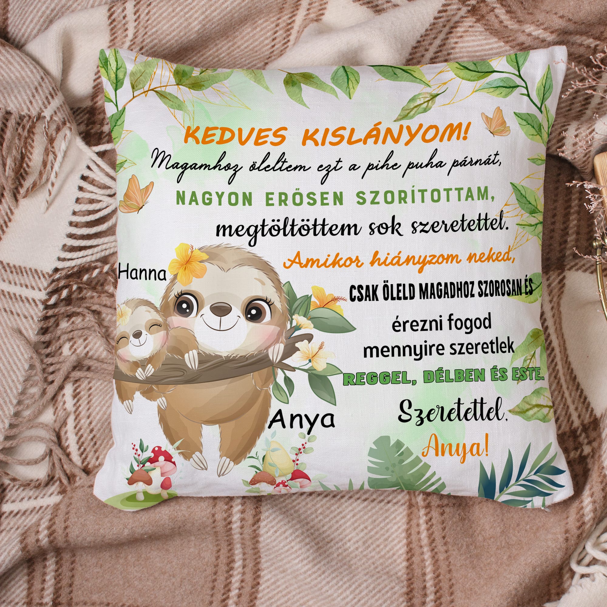 Egyedi 40 x 40 cm párna, félszatén anyagú fehér párnahuzattal.