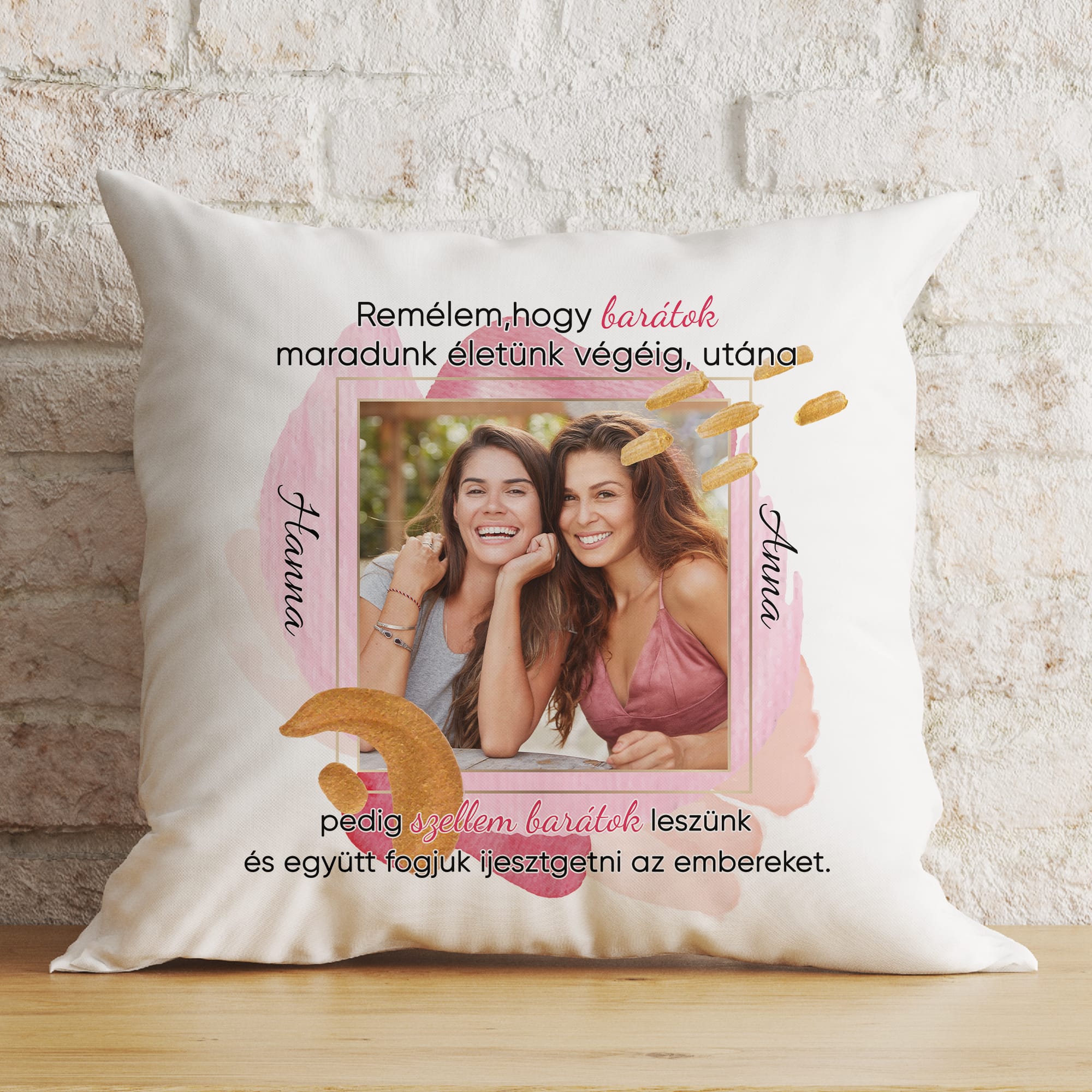 Egyedi 40 x 40 cm párna, félszatén anyagú fehér párnahuzattal.