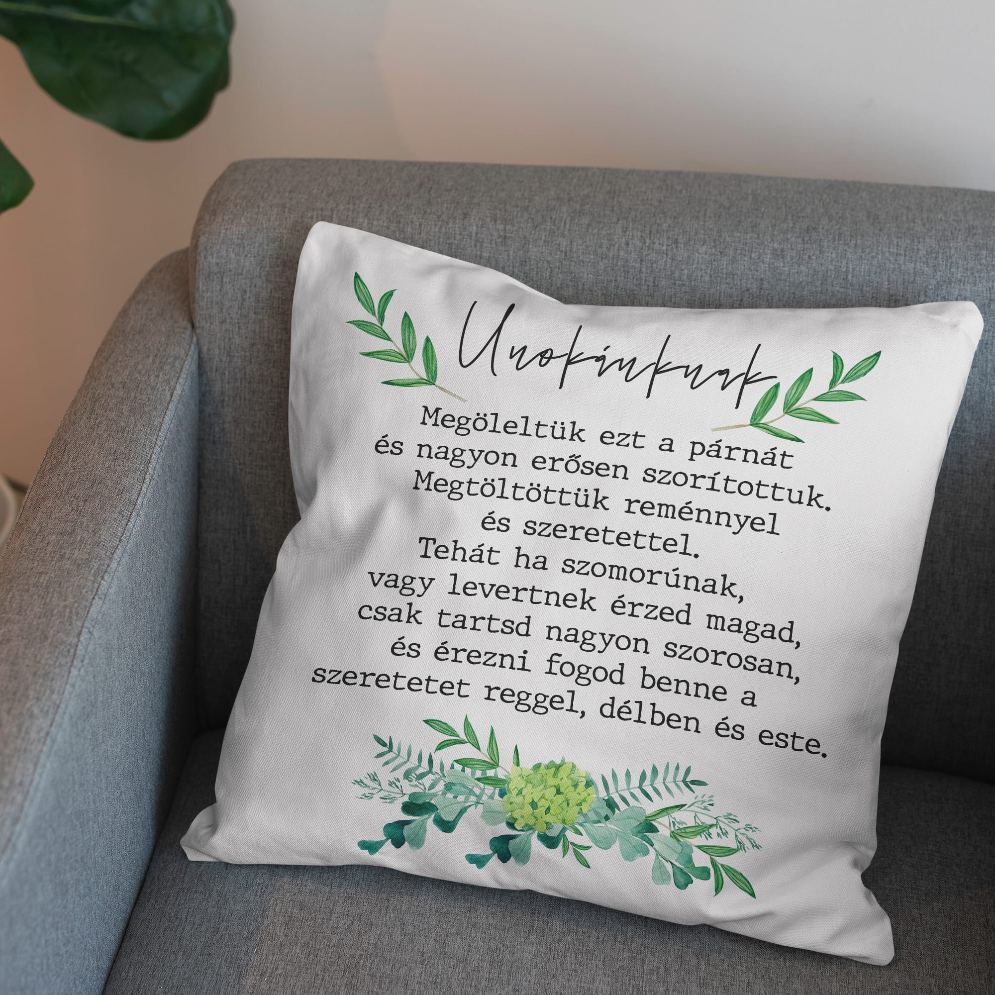 Egyedi 40 x 40 cm párna, félszatén anyagú fehér párnahuzattal.